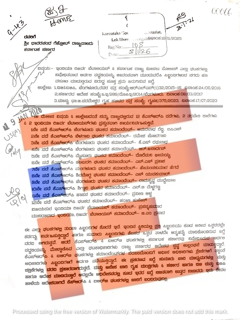 ಬೆಂಗಳೂರು; ಕರ್ನಾಟಕ ರಾಜ್ಯ ಮೀಸಲು ಪೊಲೀಸ್ ಎಲ್ಲಾ ಘಟಕಗಳು ಮತ್ತು ಇಮಡಿಯಾ ರಿಜರ್ವ್ ಬೆಟಾಲಿಯನ್ ಘಠಕಗಳಲ್ಲಿ ಆರ್ಡರ್ಲಿ ರದ್ದಾಗಿದ್ದರೂ ಸಹ ಜೀವಂತವಾಗಿರಿಸಲಾಗಿದೆ. ಅಲ್ಲದೇ ಸಿಬ್ಬಂದಿಗಳಿಂದ ನಗದು ಹಣ ವಸೂಲು ಮಾಡಲಾಗುತ್ತಿದೆ ಎಂಬ ಸಂಗತಿಯು ರಾಜ್ಯಪಾಲರ ಮೆಟ್ಟಿಲೇರಿರುವುದು ಇದೀಗ ಬಹಿರಂಗವಾಗಿದೆ.