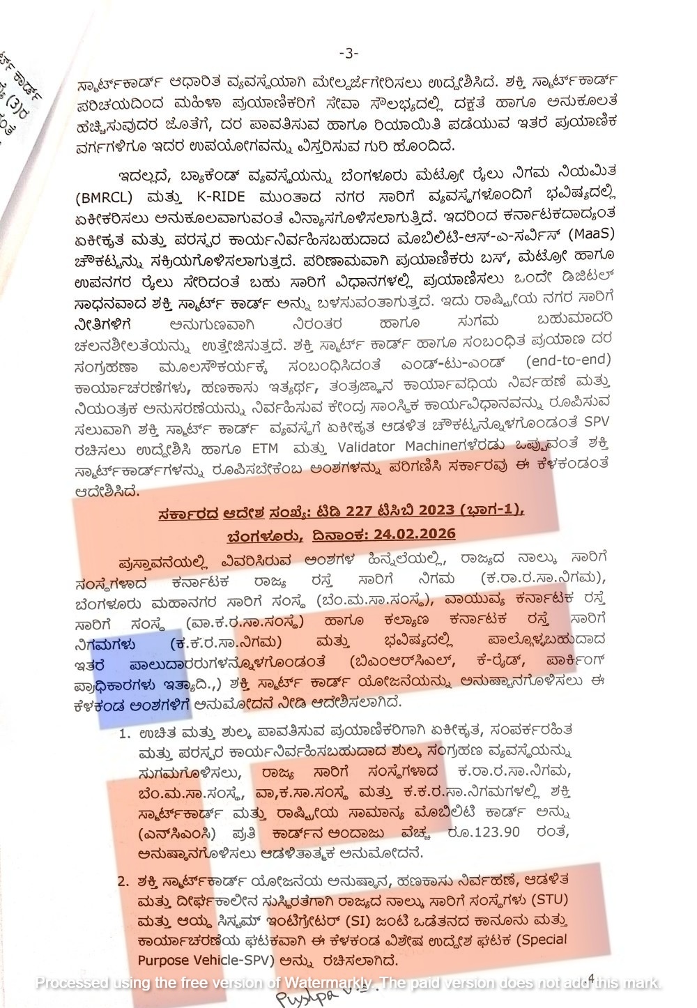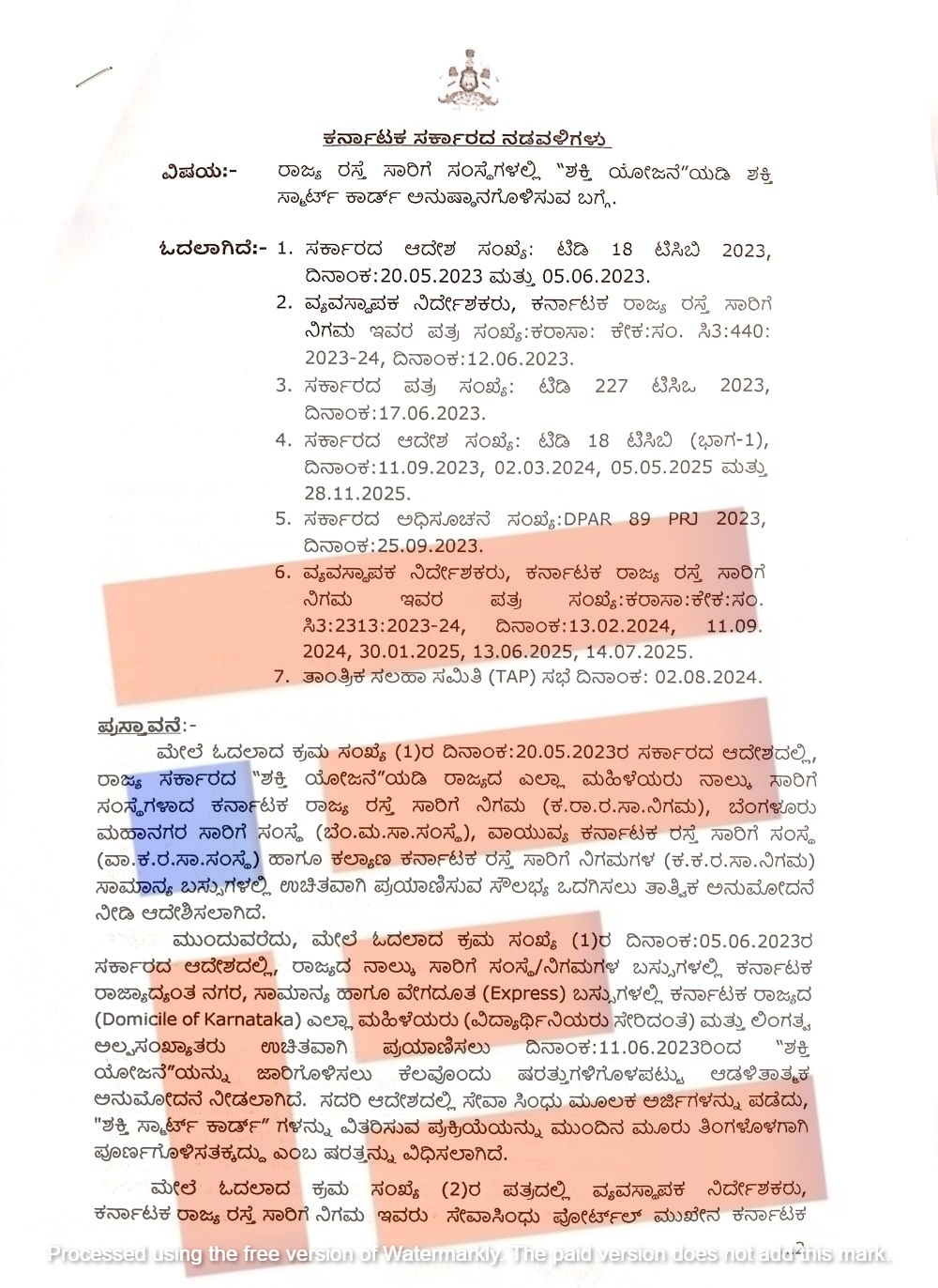 ಉಚಿತ ಮತ್ತು ಶುಲ್ಕ ಪಾವತಿಸುವ ಪ್ರಯಾಣಿಕರಿಗಾಗಿ ಏಕೀಕೃತ, ಸಂಪರ್ಕರಹಿತ ಮತ್ತು ಪರಸ್ಪರ ಕಾರ್ಯನಿರ್ವಹಿಸಬಹುದಾದ ಶುಲ್ಕ ಸಂಗ್ರಹಣೆ ವ್ಯವಸ್ಥೆಯನ್ನು ಸುಗಮಗೊಳಿಸಲು ಕರ್ನಾಟಕ ರಾಜ್ಯ ರಸ್ತೆ ಸಾರಿಗೆ ನಿಗಮ, ಬೆಂಗಳೂರು ಮಹಾನಗರ ಸಾರಿಗೆ, ವಾಯುವ್ಯ, ಕಲ್ಯಾಣ ಕರ್ನಾಟಕ ಸಾರಿಗೆ ನಿಗಮಗಳಲ್ಲಿ ಶಕ್ತಿ ಸ್ಮಾರ್ಟ್‌ ಕಾರ್ಡ್‌ ಮತ್ತು ರಾಷ್ಟ್ರೀಯ ಸಾಮಾನ್ಯ ಮೊಬಿಲಿಸಿ (ಎನ್‌ಸಿಎಂಸಿ) ಅನುಷ್ಠಾನಕ್ಕೆ ಆಡಳಿತಾತ್ಮಕ ಅನುಮೋದನೆ ಕೋರಿತ್ತು.