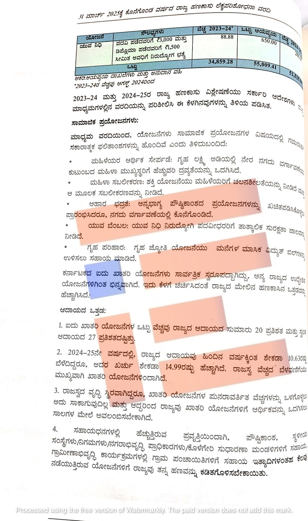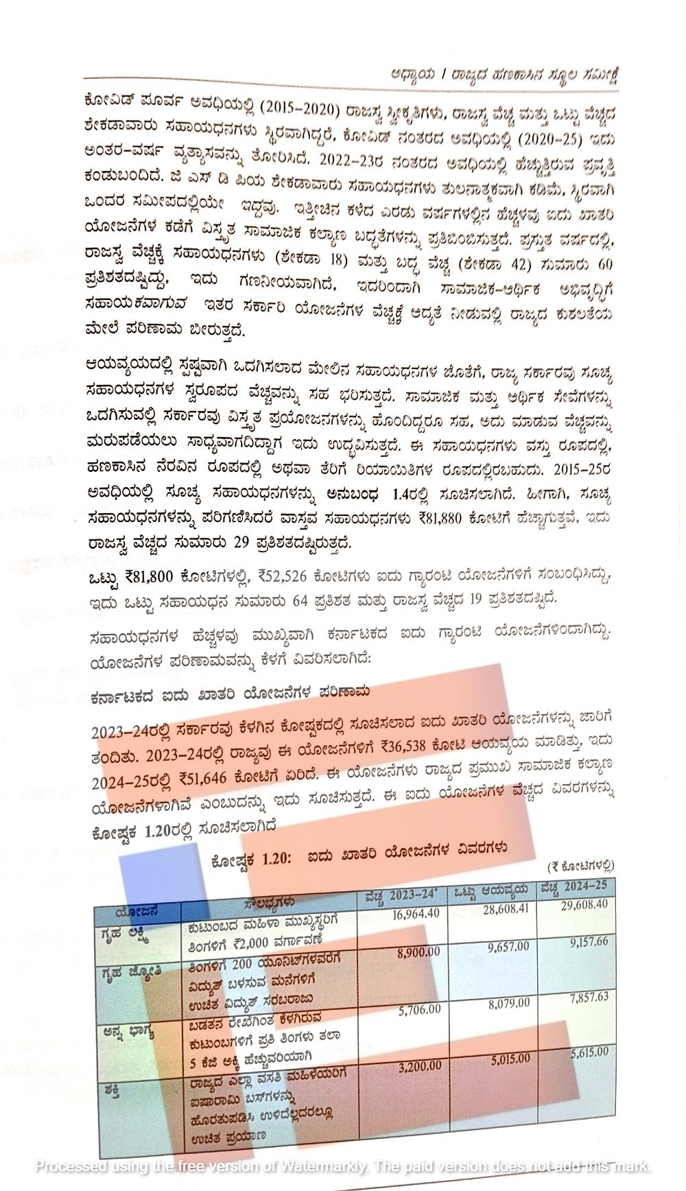 2023-24ರಲ್ಲಿ ಐದು ಗ್ಯಾರಂಟಿ ಯೋಜನೆಗಳಿಗೆ 36,538 ಕೋಟಿ ರು ಆಯವ್ಯಯ ಮಾಡಿತ್ತು. ಇದು 2024-25ರಲ್ಲಿ 51,646 ಕೋಟಿಗೆ ಏರಿದೆ. ಈ ಯೋಜನೆಗಳು ರಾಜ್ಯದ ಪ್ರಮುಖ ಸಾಮಾಜಿಕ ಕಲ್ಯಾಣ ಯೋಜನೆಗಳಾಗಿವೆ ಎಂದು ಸಿಎಜಿ ವರದಿಯು ಬಣ್ಣಿಸಿದೆ. ಅಲ್ಲದೇ ಈ ಯೋಜನೆಗಳ ಸಾಮಾಜಿಕ ಪರಿಣಾಮಗಳನ್ನು ವಿಶ್ಲೇಷಿಸಲು ಸಿಎಜಿಯು ಮಾಧ್ಯಮ ವರದಿಗಳನ್ನು ಅವಲಂಬಿಸಿದೆ.