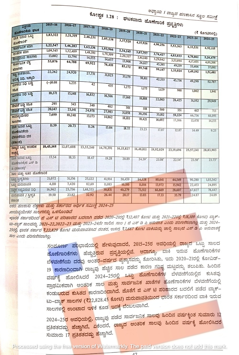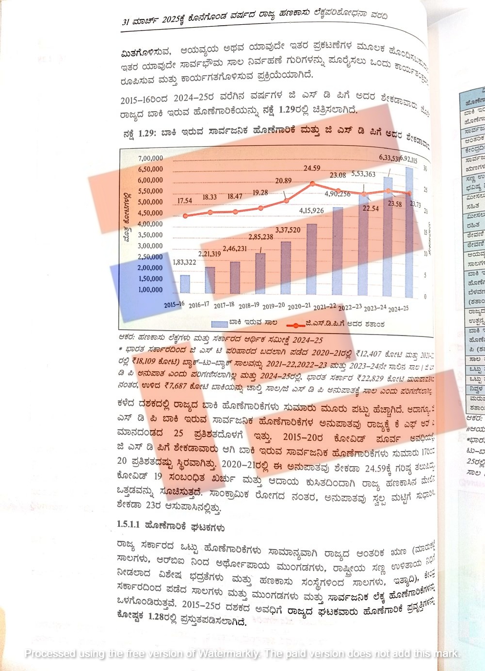 ಬೆಂಗಳೂರು; 2024-25ನೇ ಸಾಲಿನಲ್ಲಿ ರಾಜ್ಯ ಕಾಂಗ್ರೆಸ್ ಸರ್ಕಾರವು ಪಡೆದಿರುವ ಸಾರ್ವಜನಿಕ ಸಾಲವು ಹಿಂದಿನ ವರ್ಷಕ್ಕಿಂತ ಸುಮಾರು 12 ಪ್ರತಿಶತದಷ್ಟು ಹೆಚ್ಚಾಗಿದೆ ಎಂದು ಭಾರತದ ಲೆಕ್ಕ ನಿಯಂತ್ರಕರು ಮತ್ತು ಮಹಾಲೆಕ್ಕ ಪರಿಶೋಧಕರು ಅಂಕಿ ಅಂಶಗಳ ಸಮೇತ ವಿಶ್ಲೇಷಣೆ ಮೂಲಕ ವಿಶ್ಲೇಷಣೆ ಮಾಡಿದ್ದಾರೆ.