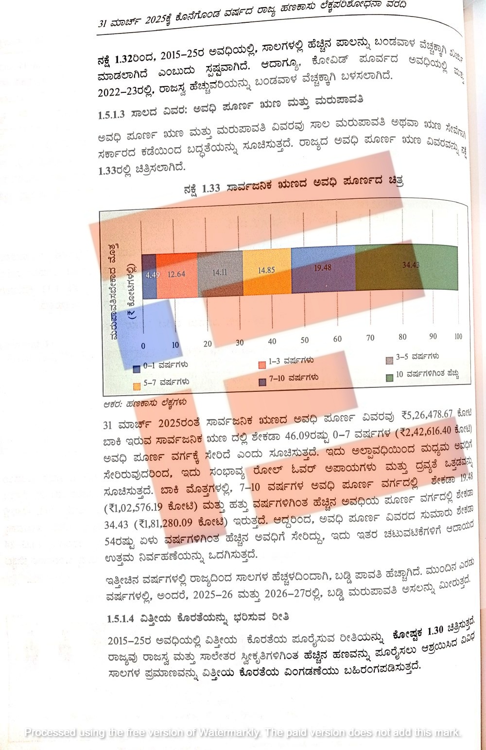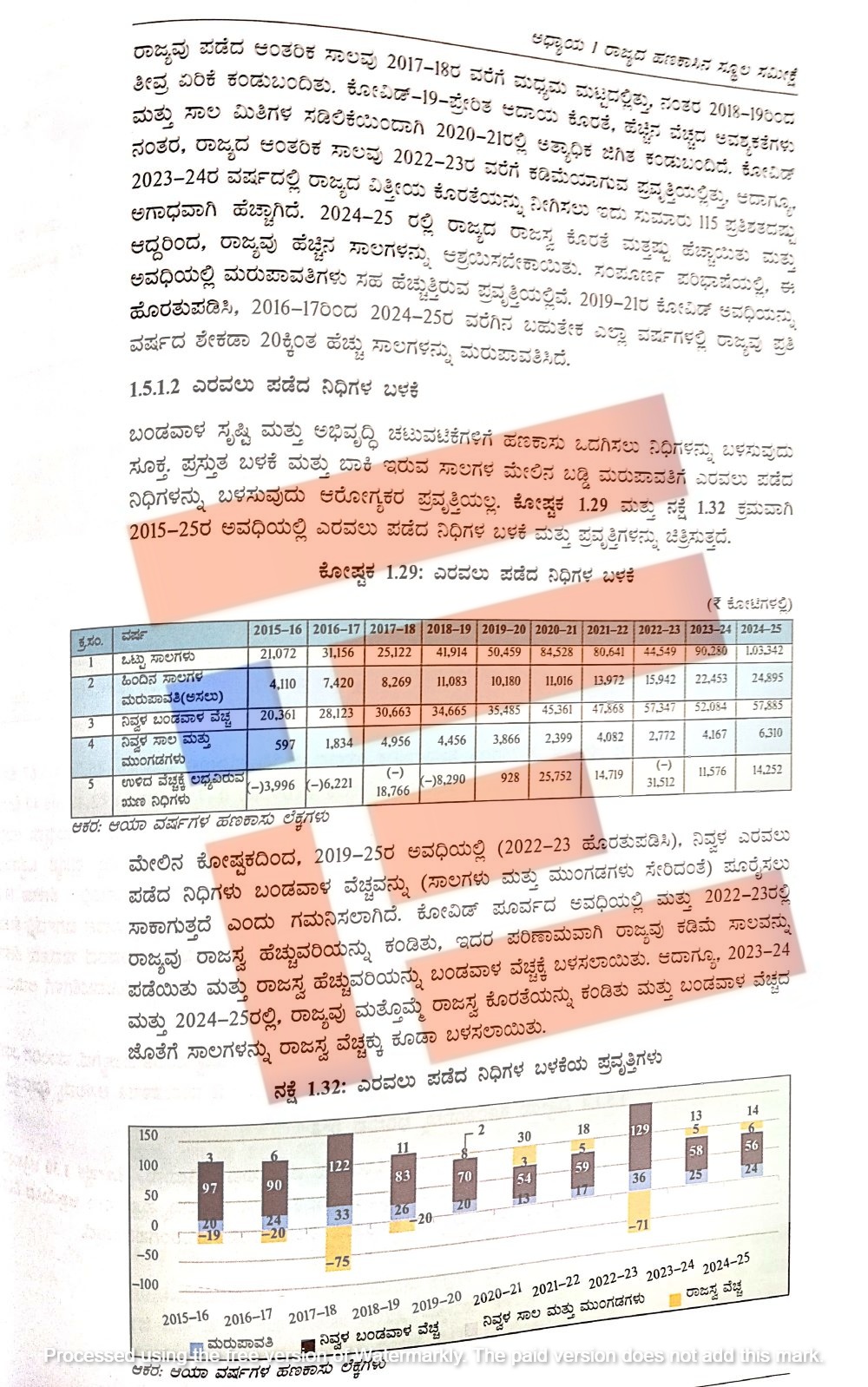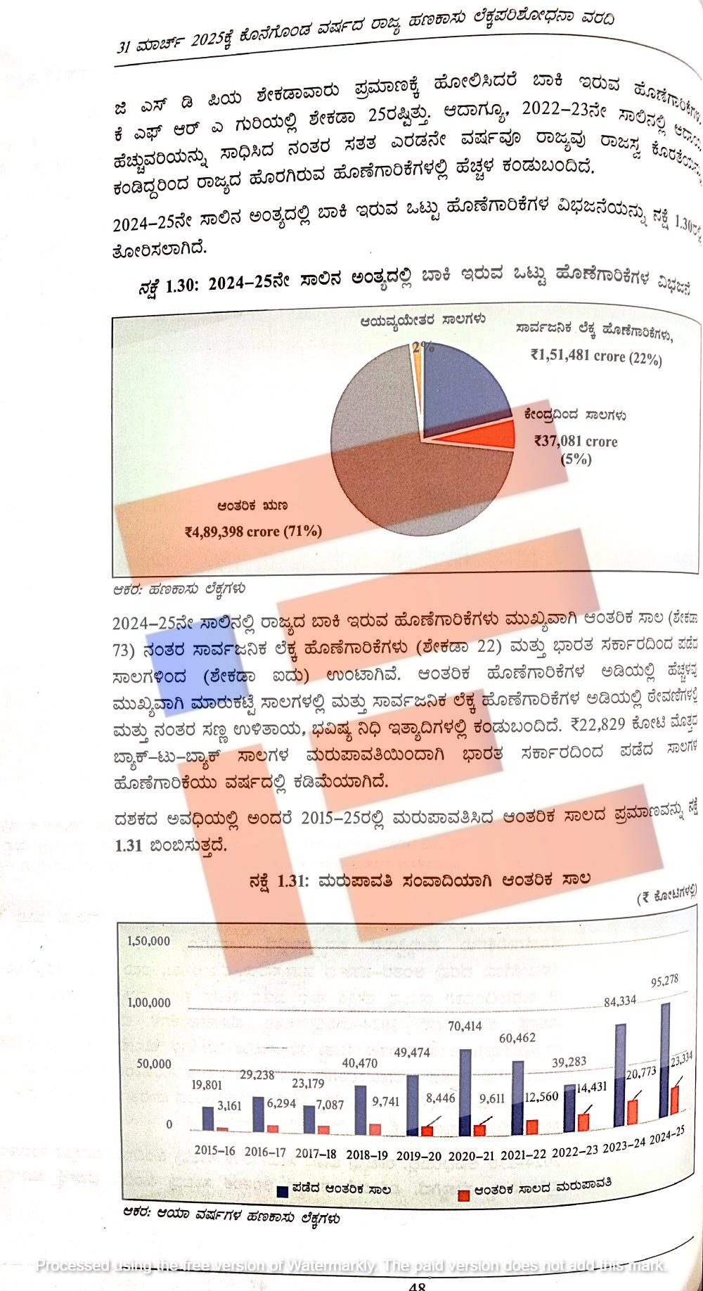 ಹಿಂದಿನ ಸಾಲಗಳ ಅಸಲನ್ನು ಮರು ಪಾವತಿಸಲು 2015-16ರಲ್ಲಿ 4,110 ಕೋಟಿ, 2016-17ರಲ್ಲಿ 7,420 ಕೋಟಿ, 2017-18ರಲ್ಲಿ 8,269 ಕೋಟಿ, 2018-19ರಲ್ಲಿ 11,083 ಕೋಟಿ, 2019-20ರಲ್ಲಿ 10,016 ಕೋಟಿ, 2020-21ರಲ್ಲಿ 13,972 ಕೋಟಿ, 2022-23ರಲ್ಲಿ 15,942 ಕೋಟಿ, 2023-24ರಲ್ಲಿ 22,453 ಕೋಟಿ, 2024-25ರಲ್ಲಿ 24,895 ಕೋಟಿ ಮರು ಪಾವತಿಸಿತ್ತು.
