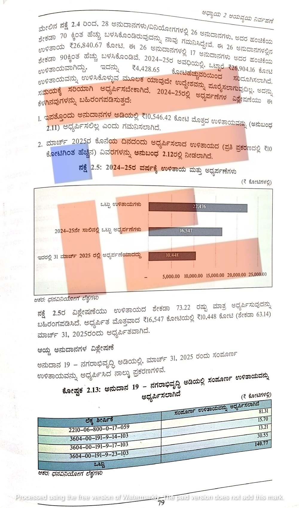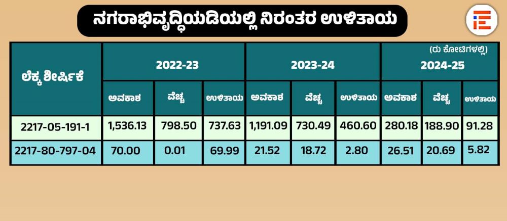 ಅದೇ ರೀತಿ 2023-24ರಲ್ಲಿ ಈ ಎರಡೂ ಲೆಕ್ಕ ಶೀರ್ಷಿಕೆಗಳಿಗೆ 1,212.61 ಕೋಟಿ ರುಪಾಯಿ ಮೊತ್ತದ ಅನುದಾನ ಅವಕಾಶ ಕಲ್ಪಿಸಿತ್ತು. ಈ ಪೈಕಿ 749.21 ಕೋಟಿ ರುಪಾಯಿ ವೆಚ್ಚ ಮಾಡಿದ್ದ ನಗರಾಭಿವೃದ್ಧಿ ಇಲಾಖೆಯು 463.4 ಕೋಟಿ ರುಪಾಯಿಗಳನ್ನು ಖರ್ಚು ಮಾಡದೇ ಉಳಿತಾಯ ಮಾಡಿತ್ತು. 2024-25ನೇ ಸಾಲಿನಲ್ಲಿಯೂ ಸಹ ಈ ಎರಡೂ ಲೆಕ್ಕ ಶೀರ್ಷಿಕೆಗಳಿಗೆ 306.69 ಕೋಟಿ ರುಪಾಯಿ ಅನುದಾನ ಅವಕಾಶವಿತ್ತು. ಈ ಪೈಕಿ 209.59 ಕೋಟಿಯಷ್ಟು ಅನುದಾನವನ್ನು ಖರ್ಚು ಮಾಡಿತ್ತು. 97. 1 ಕೋಟಿ ರುಪಾಯಿಗಳನ್ನು ಖರ್ಚು ಮಾಡದೇ ಬಾಕಿ ಉಳಿಸಿಕೊಂಡಿತ್ತು .
