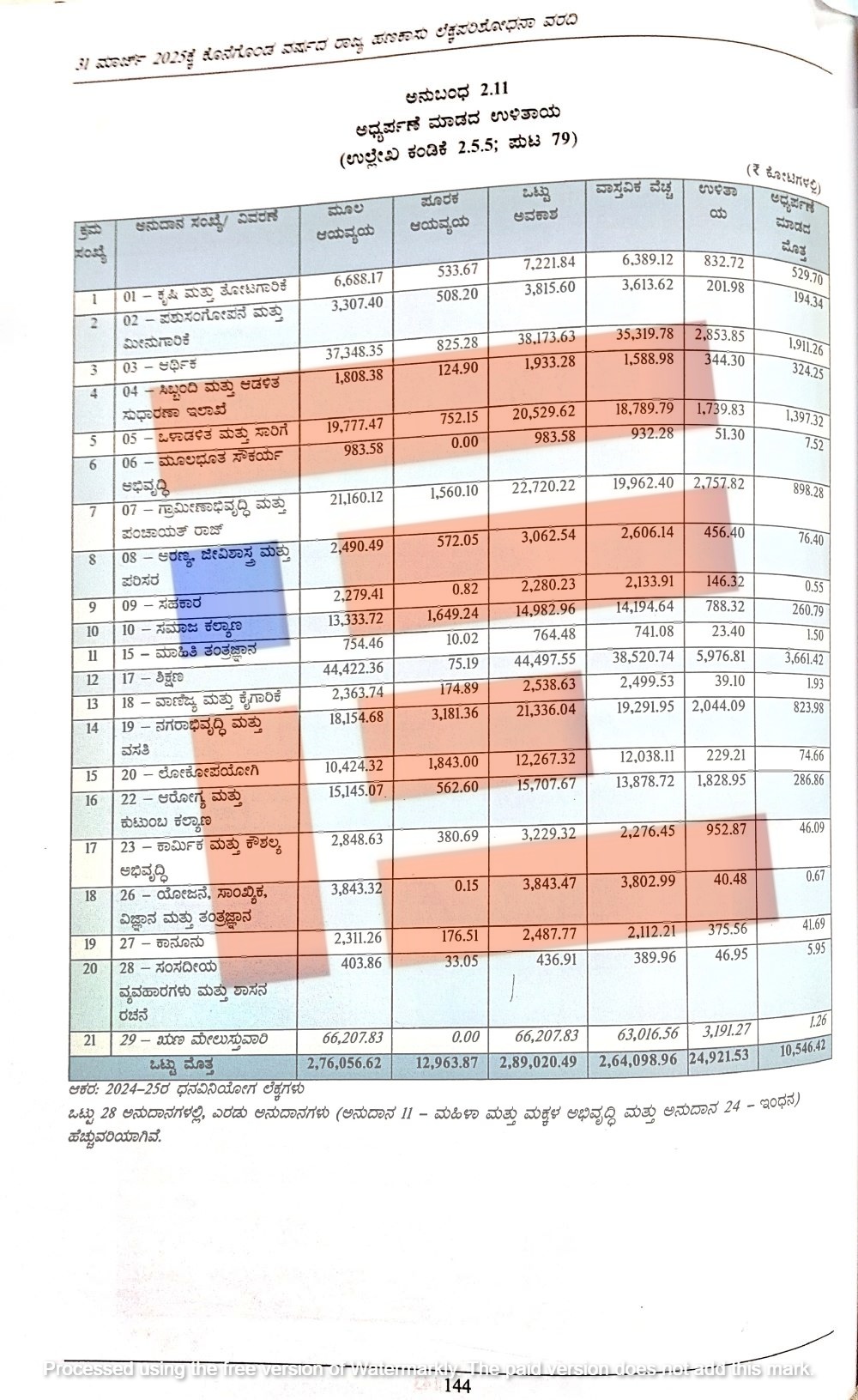 ಮೂಲಭೂತ ಸೌಕರ್ಯ ಅಭಿವೃದ್ಧಿ ಇಲಾಖೆಗೆ 983.58 ಕೋಟಿ ರುಪಾಯಿ ಅನುದಾನದ ಪೈಕಿ 932.28 ಕೋಟಿ ರುಪಾಯಿ ವಾಸ್ತವಿಕ ವೆಚ್ಚ ಮಾಡಿತ್ತು. ಈ ಪೈಕಿ 51.30 ಕೋಟಿ ರುಪಾಯಿ ಉಳಿತಾಯ ಮಾಡಿತ್ತಾದರೂ ಇದರಲ್ಲಿ 7.52 ಕೋಟಿ ರುಪಾಯಿಯನ್ನು ವಾಪಸ್ ಮಾಡಿರಲಿಲ್ಲ. ಗ್ರಾಮೀಣಾಭಿವೃದ್ಧಿ ಮತ್ತು ಪಂಚಾಯತ್ರಾಜ್ ಇಲಾಖೆಯು 22,720.22 ಕೋಟಿ ರುಪಾಯಿ ಒಟ್ಟು ಅನುದಾನದ ಅವಕಾಶದ ಪೈಕಿ 19,962.40 ಕೋಟಿ ರುಪಾಯಿ ವಾಸ್ತವಿಕ ವೆಚ್ಚ ಮಾಡಿತ್ತು. 2,757.82 ಕೋಟಿ ರುಪಾಯಿ ಉಳಿತಾಯ ಮಾಡಿತ್ತಾದರೂ 898.28 ಕೋಟಿ ರುಪಾಯಿಗಳನ್ನು ಸರ್ಕಾರಕ್ಕೆ ಮರಳಿಸಿರಲಿಲ್ಲ.