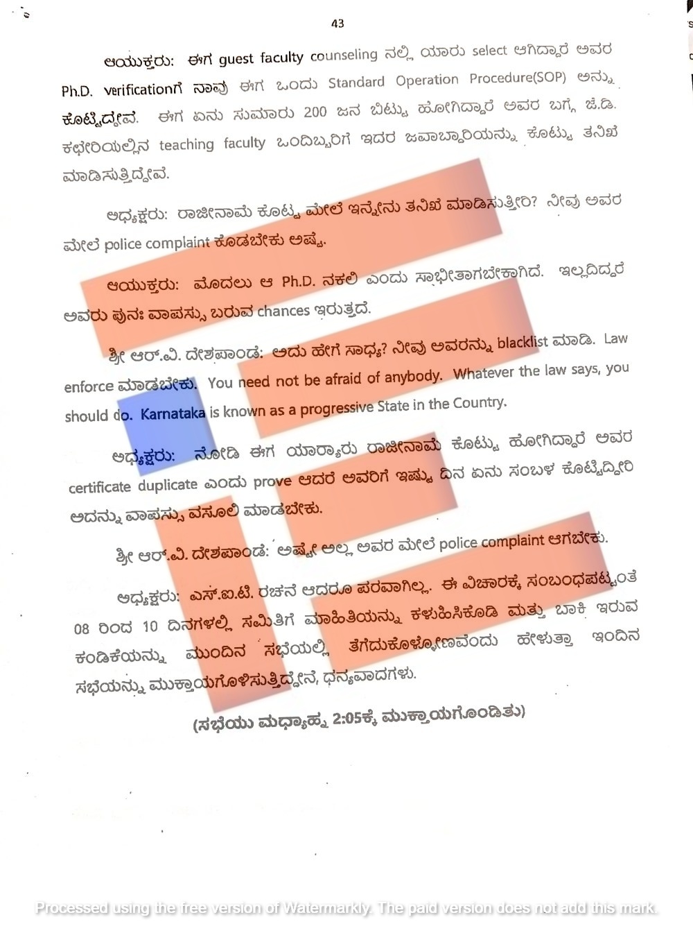 ಸಮಿತಿ ಅಧ್ಯಕ್ಷರು ಕೇಳಿದ್ದ ಪ್ರಶ್ನೆಗೆ ಉತ್ತರಿಸಿದ್ದ ಕಾಲೇಜು ಶಿಕ್ಷಣ ಇಲಾಖೆಯ ಆಯುಕ್ತರು ‘ ಈಗ ಗೆಸ್ಟ್ ಫ್ಯಾಕಲ್ಟಿ ಕೌನ್ಸಲಿಂಗ್ನಲ್ಲಿ ಯಾರು ಸೆಲೆಕ್ಟ್ ಆಗಿದ್ದಾರೆ ಅವರ ಪಿಎಚ್ಡಿ ವೆರಿಫಿಕೇಷನ್ ಗೆ ನಾವು ಈಗ ಒಂದು ಎಸ್ಒಪಿ ಅನ್ನು ಕೊಟ್ಟಿದ್ದೇವೆ. ಈಗ ಏನು ಸುಮಾರು 200 ಜನ ಬಿಟ್ಟು ಹೋಗಿದ್ದಾರೆ ಅವರ ಬಗ್ಗೆ ಜೆ ಡಿ ಕಚೇರಿಯಲ್ಲಿನ ಟೀಚಿಂಗ್ ಫ್ಯಾಕಲ್ಟಿ ಒಂದಿಬ್ಬರಿಗೆ ಇದರ ಜವಾಬ್ದಾರಿ ಕೊಟ್ಟು ತನಿಖೆ ಮಾಡಿಸುತ್ತಿದ್ದೇವೆ,’ ಎಂದು ಉತ್ತರಿಸಿದ್ದರು.