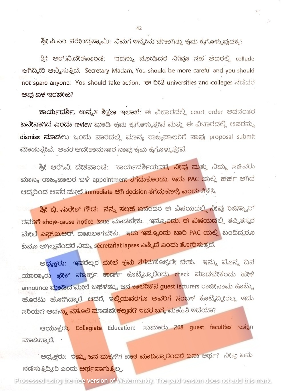 ಇದಕ್ಕೆ ಉತ್ತರಿಸಿದ್ದ ಕಾಲೇಜು ಶಿಕ್ಷಣ ಇಲಾಖೆಯ ಆಯುಕ್ತರು ‘ಸುಮಾರು 208 ಮಂದಿ ಗೆಸ್ಟ್ ಫ್ಯಾಕಲ್ಟಿ ರಿಸೈನ್ ಮಾಡಿದ್ದಾರೆ,’ ಎಂದು ಸಮಿತಿಗೆ ಮಾಹಿತಿ ಒದಗಿಸಿದ್ದಾರೆ. ಇದಕ್ಕೆ ಪ್ರತಿಕ್ರಿಯಿಸಿದ್ದ ಸಮಿತಿ ಅಧ್ಯಕ್ಷರು ‘ ಇಷ್ಟು ಜನ ಮಕ್ಕಳಿಗೆ ಪಾಠ ಮಾಡಿದ್ದಾರೆಂದರೆ ಏನು ಅರ್ಥ?, ನೀವು ಏನು ನಡೆಸುತ್ತಿದ್ದೀರಿ ಎಂದು ಅರ್ಥವಾಗುತ್ತಿಲ್ಲ,’ ಎಂದು ಕೇಳಿರುವುದು ಸಭೆಯ ನಡವಳಿಯಿಂದ ತಿಳಿದು ಬಂದಿದೆ.