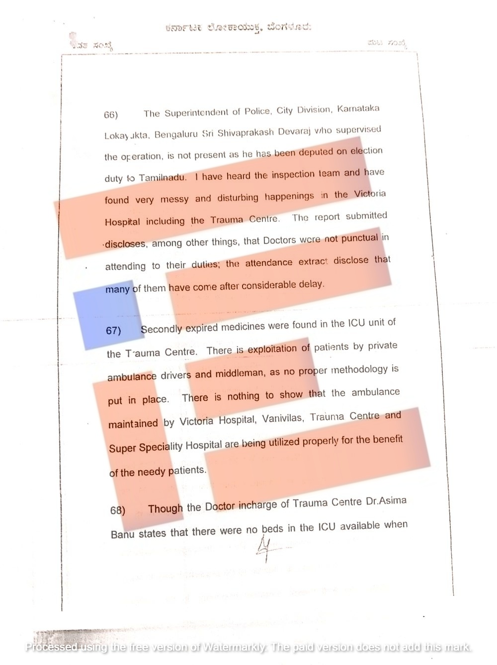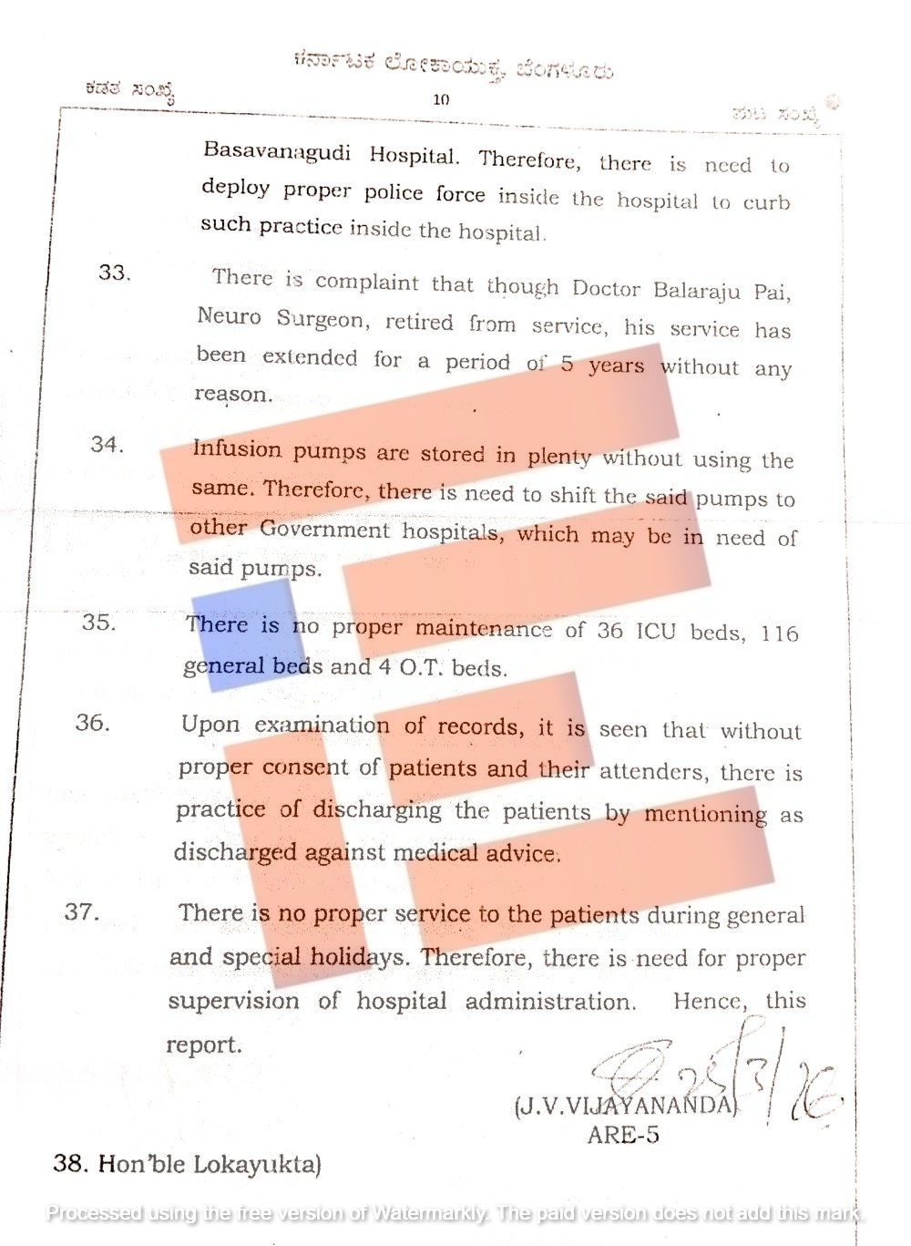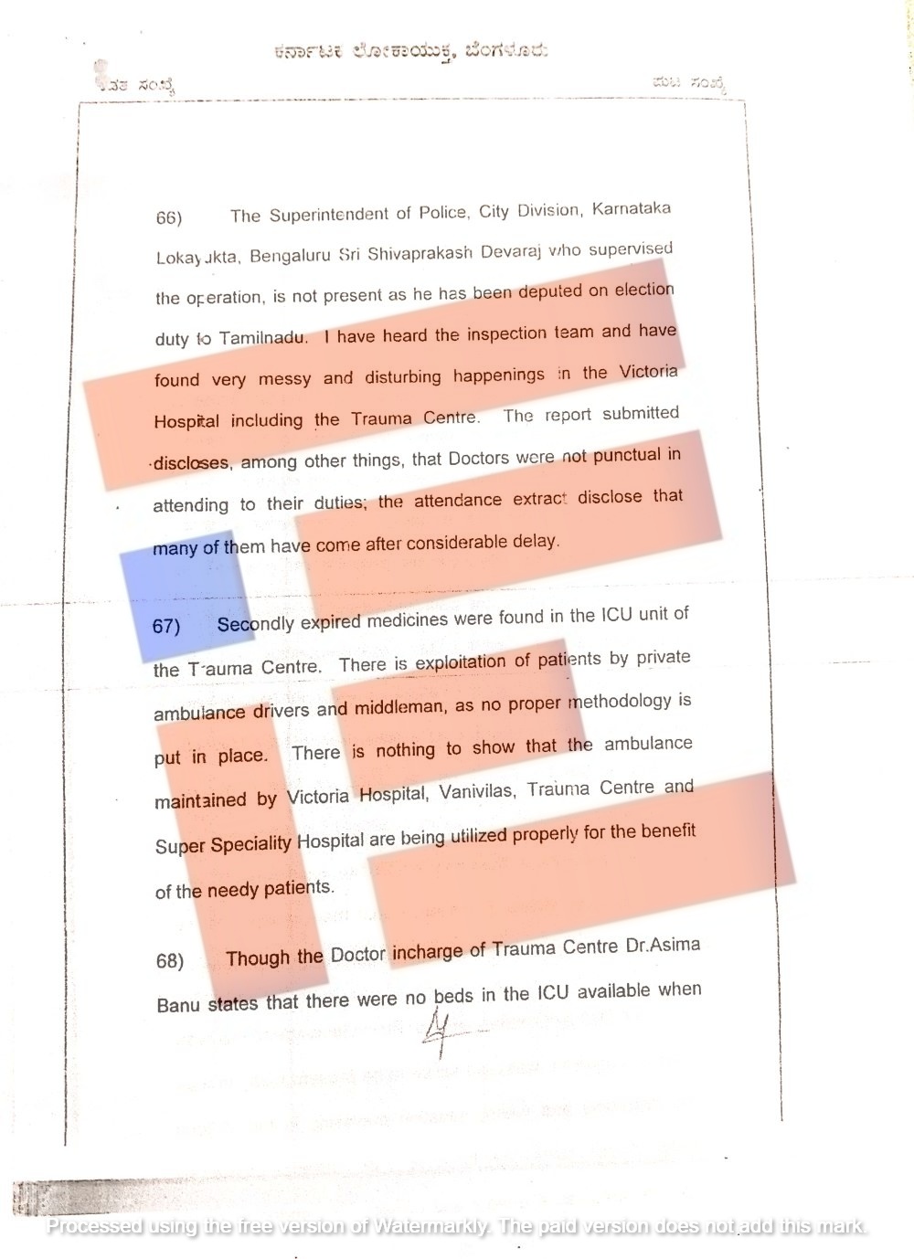 ಹೀಗೆ ವಿಕ್ಟೋರಿಯಾ ಆಸ್ಪತ್ರೆಯಲ್ಲಿ ಅಸ್ತವ್ಯಸ್ತ, ದುರಾಡಳಿತ, ಕರ್ತವ್ಯ ನಿರ್ಲಕ್ಷ್ಯ ಸೇರಿದಂತೆ ಇನ್ನಿತರೆ ಗಂಭೀರ ಲೋಪದೋಷಗಳನ್ನು ಲೋಕಾಯುಕ್ತ ತನಿಖಾ ತಂಡವು ಪತ್ತೆ ಹಚ್ಚಿದೆ.