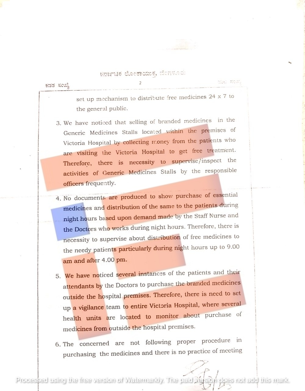 ಅತ್ಯಾವಶ್ಯಕ ಔಷಧಿಗಳನ್ನು ಖರೀದಿಸಿದೆ. ಮತ್ತು ಅವುಗಳನ್ನು ರಾತ್ರಿಯ ಸಮಯದಲ್ಲಿ ಸಿಬ್ಬಂದಿ ನರ್ಸ್ ಮತ್ತು ವೈದ್ಯರ ಬೇಡಿಕೆಯ ಮೇರೆಗೆ ರೋಗಿಗಳಿಗೆ ವಿತರಿಸಿರುವುದಕ್ಕೆ ಯಾವುದೇ ದಾಖಲೆಗಳನ್ನು ಸಲ್ಲಿಸಲಾಗಿಲ್ಲ. ಉಚಿತ ಔಷಧಿಗಳನ್ನು ಅಗತ್ಯವಿರುವ ರೋಗಿಗಳಿಗೆ, ವಿಶೇಷವಾಗಿ ರಾತ್ರಿ ಸಮಯದಲ್ಲಿ (ಬೆಳಿಗ್ಗೆ 9.00 ಗಂಟೆಯೊಳಗೆ ಮತ್ತು ಸಂಜೆ 4.00 ಗಂಟೆಯ ನಂತರ) ಸರಿಯಾಗಿ ವಿತರಿಸಲಾಗುವಂತೆ ಮೇಲ್ವಿಚಾರಣೆ ಮಾಡುವ ಅಗತ್ಯವಿದೆ ಎಂದು ವರದಿಯು ಅಭಿಪ್ರಾಯಿಸಿದೆ.