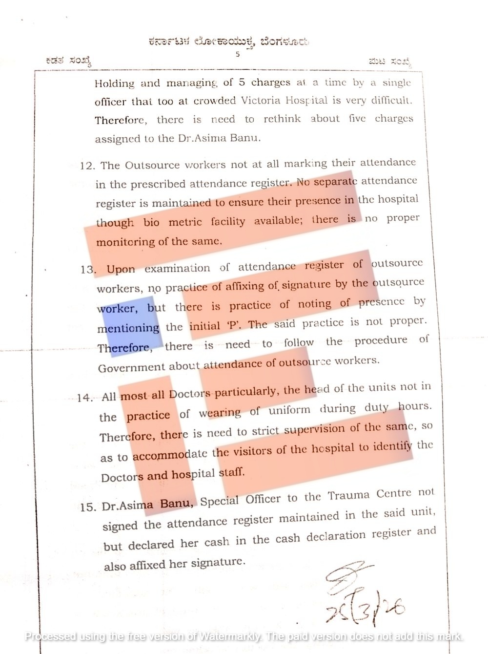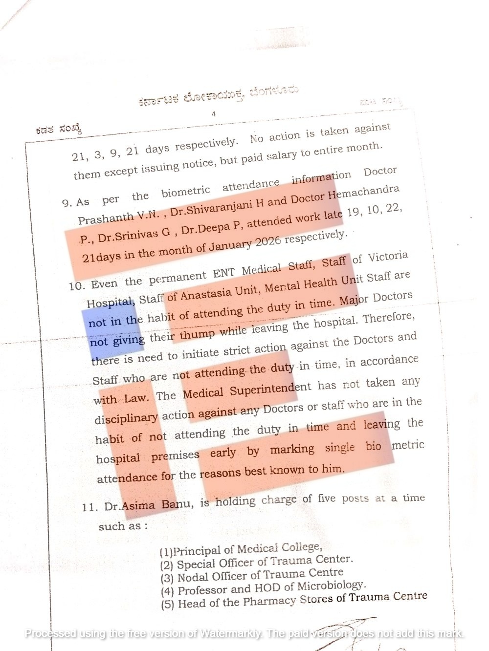 ಟ್ರಾಮಾ ಕೇಂದ್ರದ ವಿಶೇಷಾಧಿಕಾರಿ ಡಾ. ಆಸಿಮಾ ಬಾನು ಅವರು ಆ ಘಟಕದಲ್ಲಿ ನಿರ್ವಹಿಸಲಾದ ಹಾಜರಾತಿ ನೋಂದಣಿಯಲ್ಲಿ ಸಹಿ ಮಾಡಿಲ್ಲ. ಆದರೆ ನಗದು ಘೋಷಣೆ ನೋಂದಣಿಯಲ್ಲಿ ತಮ್ಮ ನಗದು ವಿವರವನ್ನು ದಾಖಲಿಸಿ ಸಹಿ ಮಾಡಿದ್ದಾರೆ ಎಂದು ವರದಿ ಹೇಳಿದೆ.