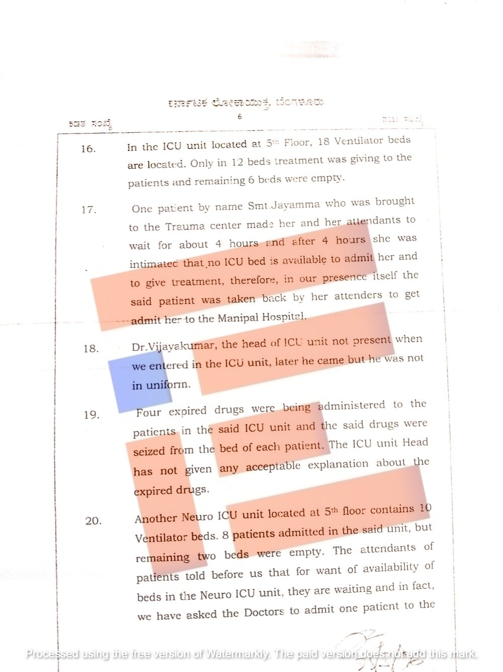 5ನೇ ಮಹಡಿಯಲ್ಲಿ ಇರುವ ಐಸಿಯು ಘಟಕದಲ್ಲಿ 18 ವೆಂಟಿಲೇಟರ್ ಹಾಸಿಗೆಗಳಿವೆ. ಅದರಲ್ಲಿ ಕೇವಲ 12 ಹಾಸಿಗೆಗಳಲ್ಲಿ ಮಾತ್ರ ರೋಗಿಗಳಿಗೆ ಚಿಕಿತ್ಸೆ ನೀಡಲಾಗುತ್ತಿತ್ತು ಮತ್ತು ಉಳಿದ 6 ಹಾಸಿಗೆಗಳು ಖಾಲಿಯಾಗಿದ್ದವು. ಜಯಮ್ಮ ಎಂಬ ರೋಗಿಯನ್ನು ಟ್ರಾಮಾ ಕೇಂದ್ರಕ್ಕೆ ತರಲಾಗಿತ್ತು. ಅವರಿಗೆ ಮತ್ತು ಅವರ ಸಹಾಯಕರಿಗೆ ಸುಮಾರು 4 ಗಂಟೆಗಳ ಕಾಲ ಕಾಯಲು ಹೇಳಲಾಯಿತು. ನಂತರ 4 ಗಂಟೆಗಳ ಬಳಿಕ, ಐಸಿಯುನಲ್ಲಿ ಹಾಸಿಗೆ ಲಭ್ಯವಿಲ್ಲ ಎಂದು ತಿಳಿಸಲಾಯಿತು ಎಂದು ಶೋಧನಾ ವೇಳೆ ಕಂಡುಕೊಂಡಿದೆ.
