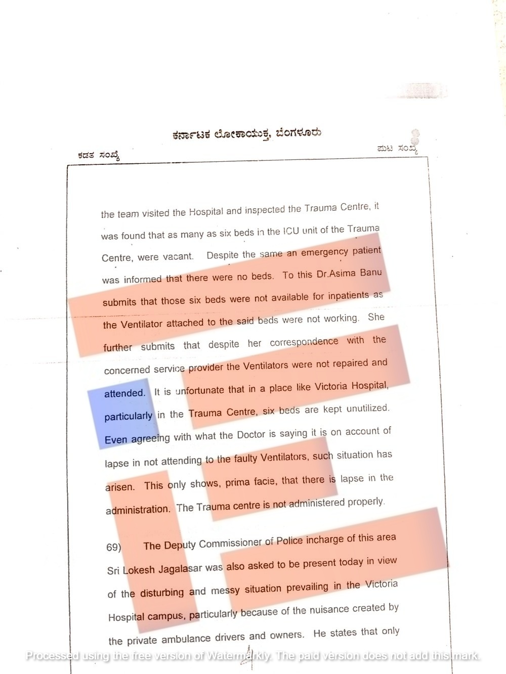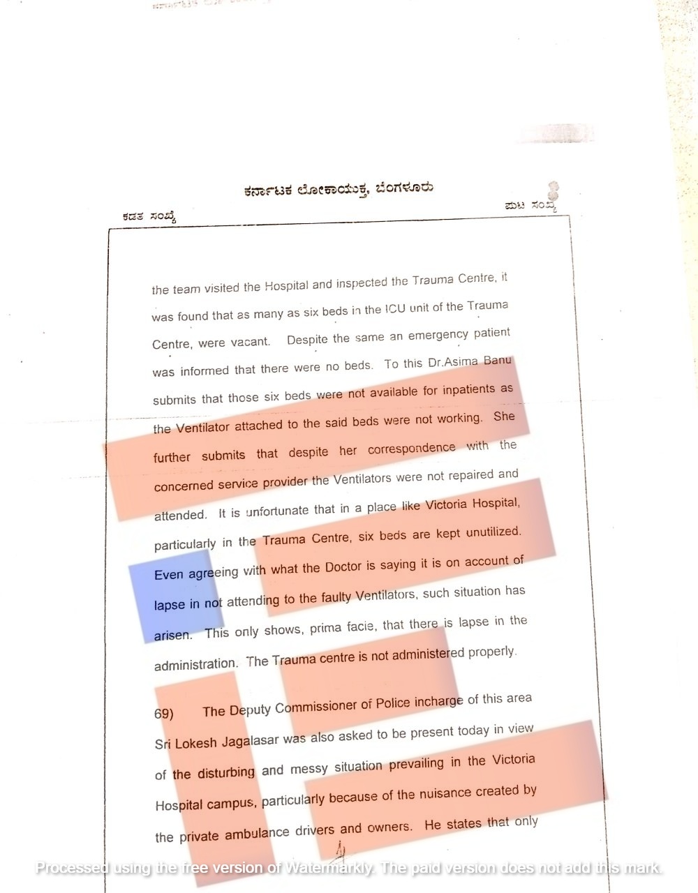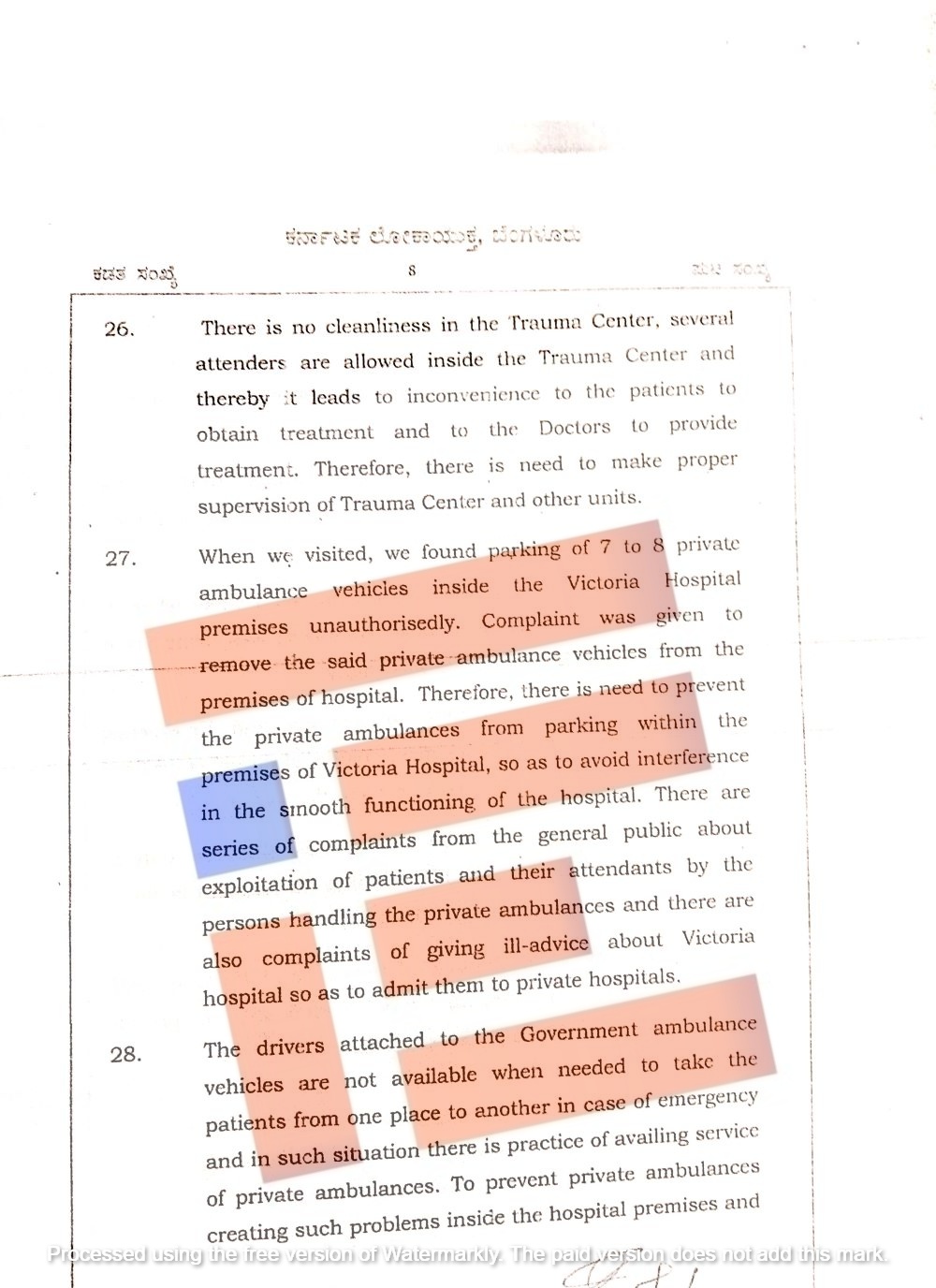 ವಿಕ್ಟೋರಿಯಾ ಆಸ್ಪತ್ರೆಯಲ್ಲಿ ಪ್ರಾಥಮಿಕ ಹಂತದಲ್ಲೇ ಆಡಳಿತದಲ್ಲಿ ನಿರ್ಲಕ್ಷ್ಯವಿದೆ. ಟ್ರಾಮಾ ಕೇಂದ್ರವನ್ನು ಸರಿಯಾಗಿ ನಿರ್ವಹಿಸಲಾಗುತ್ತಿಲ್ಲ ಎಂದು ವಿವರಿಸಿದೆ.