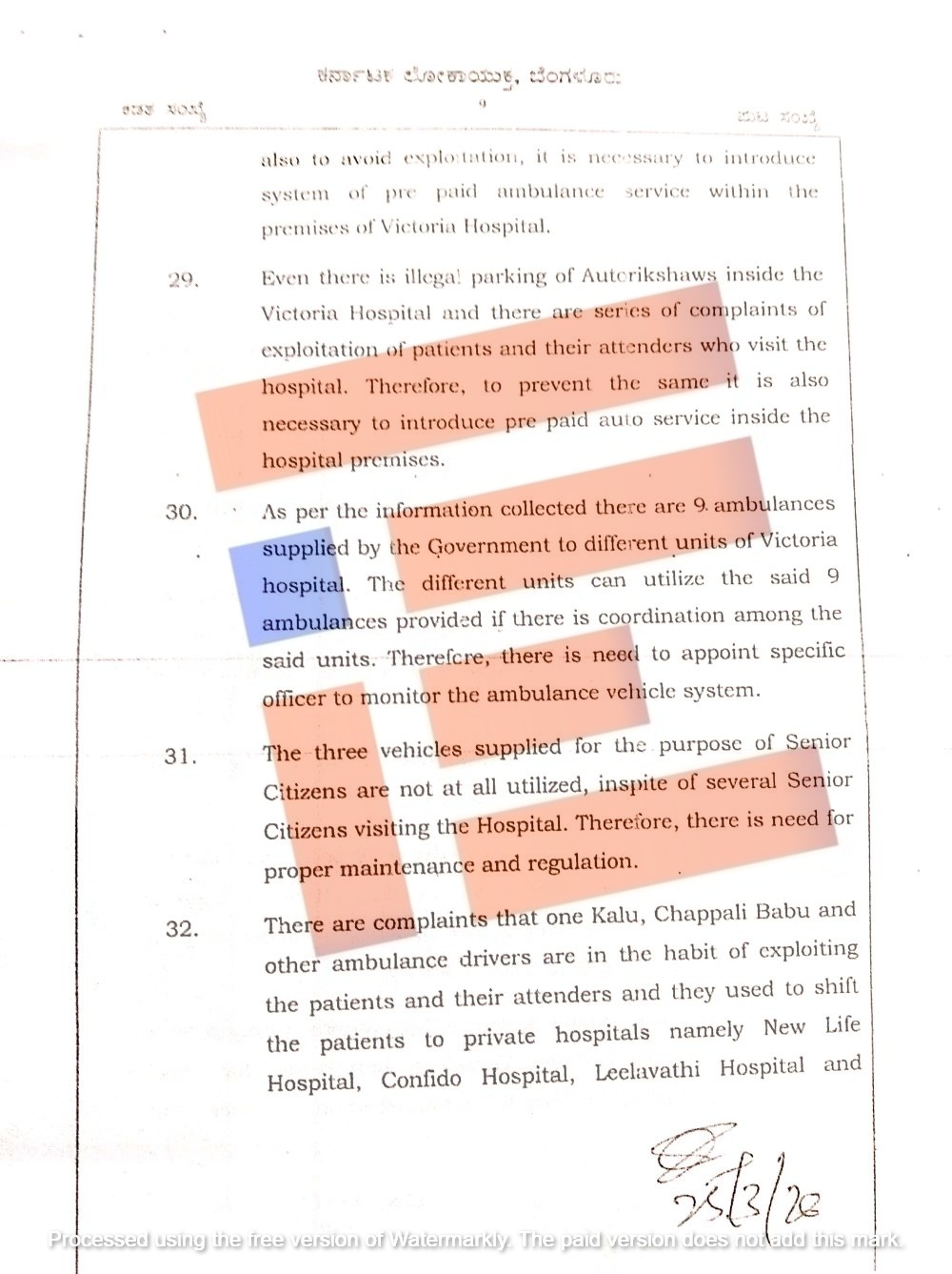ಸರ್ಕಾರಿ ಆಂಬುಲೆನ್ಸ್ ವಾಹನಗಳಿಗೆ ನಿಯೋಜಿಸಲಾದ ಚಾಲಕರು ತುರ್ತು ಪರಿಸ್ಥಿತಿಯಲ್ಲಿ ರೋಗಿಗಳನ್ನು ಒಂದು ಸ್ಥಳದಿಂದ ಮತ್ತೊಂದು ಸ್ಥಳಕ್ಕೆ ಸಾಗಿಸಲು ಅಗತ್ಯವಿರುವಾಗ ಲಭ್ಯವಿರುವುದಿಲ್ಲ. ಈ ಪರಿಸ್ಥಿತಿಯಲ್ಲಿ ಖಾಸಗಿ ಆಂಬುಲೆನ್ಸ್ ಸೇವೆಯನ್ನು ಬಳಸುವ ಪದ್ಧತಿ ಇದೆ. ಆದ್ದರಿಂದ, ಆಸ್ಪತ್ರೆ ಆವರಣದಲ್ಲಿ ಖಾಸಗಿ ಆಂಬುಲೆನ್ಸ್ಗಳಿಂದ ಉಂಟಾಗುವ ಸಮಸ್ಯೆಗಳನ್ನು ತಡೆಯುವ ಅಗತ್ಯವಿದೆ. ರೋಗಿಗಳ ಶೋಷಣೆಯನ್ನು ತಪ್ಪಿಸಲು, ವಿಕ್ಟೋರಿಯಾ ಆಸ್ಪತ್ರೆ ಆವರಣದೊಳಗೆ ಪ್ರಿಪೇಯ್ಡ್ ಆಂಬುಲೆನ್ಸ್ ಸೇವೆಯನ್ನು ಪ್ರಾರಂಭಿಸುವುದು ಅಗತ್ಯವಾಗಿದೆ ಎಂದು ವರದಿಯು ಒತ್ತಿ ಹೇಳಿದೆ.