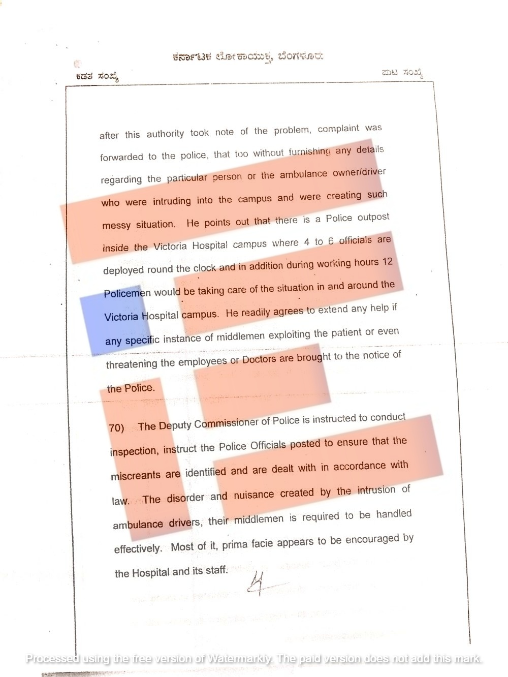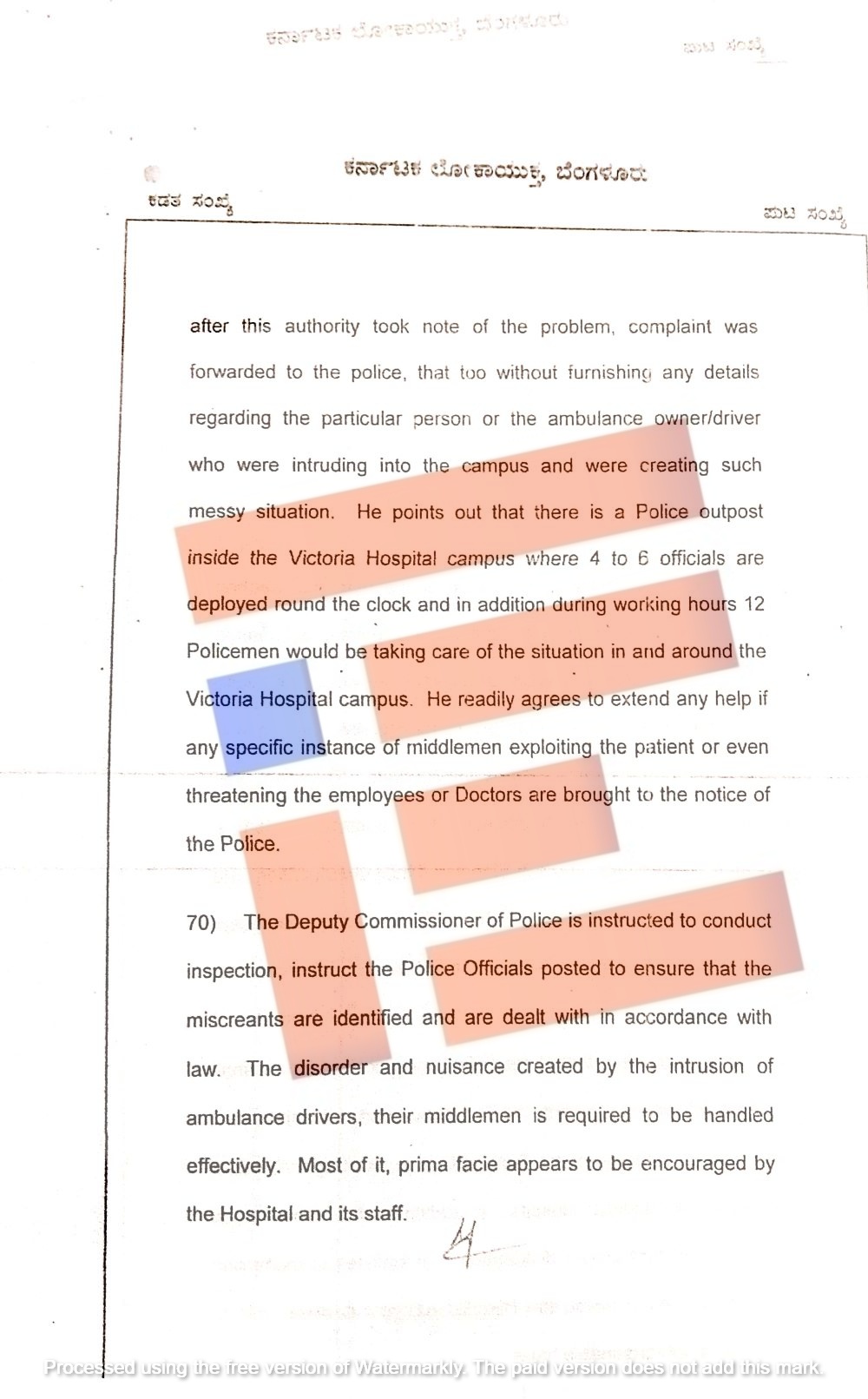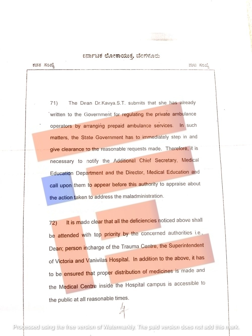 ‘ಈ ಪ್ರದೇಶದ ಪೊಲೀಸ್ ಉಪ ಆಯುಕ್ತರಿಗೆ ಪರಿಶೀಲನೆ ನಡೆಸುವಂತೆ ಸೂಚಿಸಲಾಗಿದೆ. ಅಲ್ಲದೆ, ನಿಯೋಜಿತ ಪೊಲೀಸ್ ಅಧಿಕಾರಿಗಳಿಗೆ ದುಷ್ಕರ್ಮಿಗಳನ್ನು ಗುರುತಿಸಿ ಕಾನೂನು ಪ್ರಕಾರ ಕ್ರಮ ಕೈಗೊಳ್ಳುವಂತೆ ನಿರ್ದೇಶಿಸಲಾಗಿದೆ. ಆಂಬುಲೆನ್ಸ್ ಚಾಲಕರು ಮತ್ತು ಅವರ ಮಧ್ಯವರ್ತಿಗಳಿಂದ ಉಂಟಾಗುತ್ತಿರುವ ಅಶಾಂತಿ ಮತ್ತು ಅಡಚಣೆಯನ್ನು ಪರಿಣಾಮಕಾರಿಯಾಗಿ ನಿಯಂತ್ರಿಸುವ ಅಗತ್ಯವಿದೆ,’ ಎಂದು ಲೋಕಾಯುಕ್ತರು ವರದಿಯಲ್ಲಿ ಅಭಿಪ್ರಾಯಪಟ್ಟಿದ್ದಾರೆ.