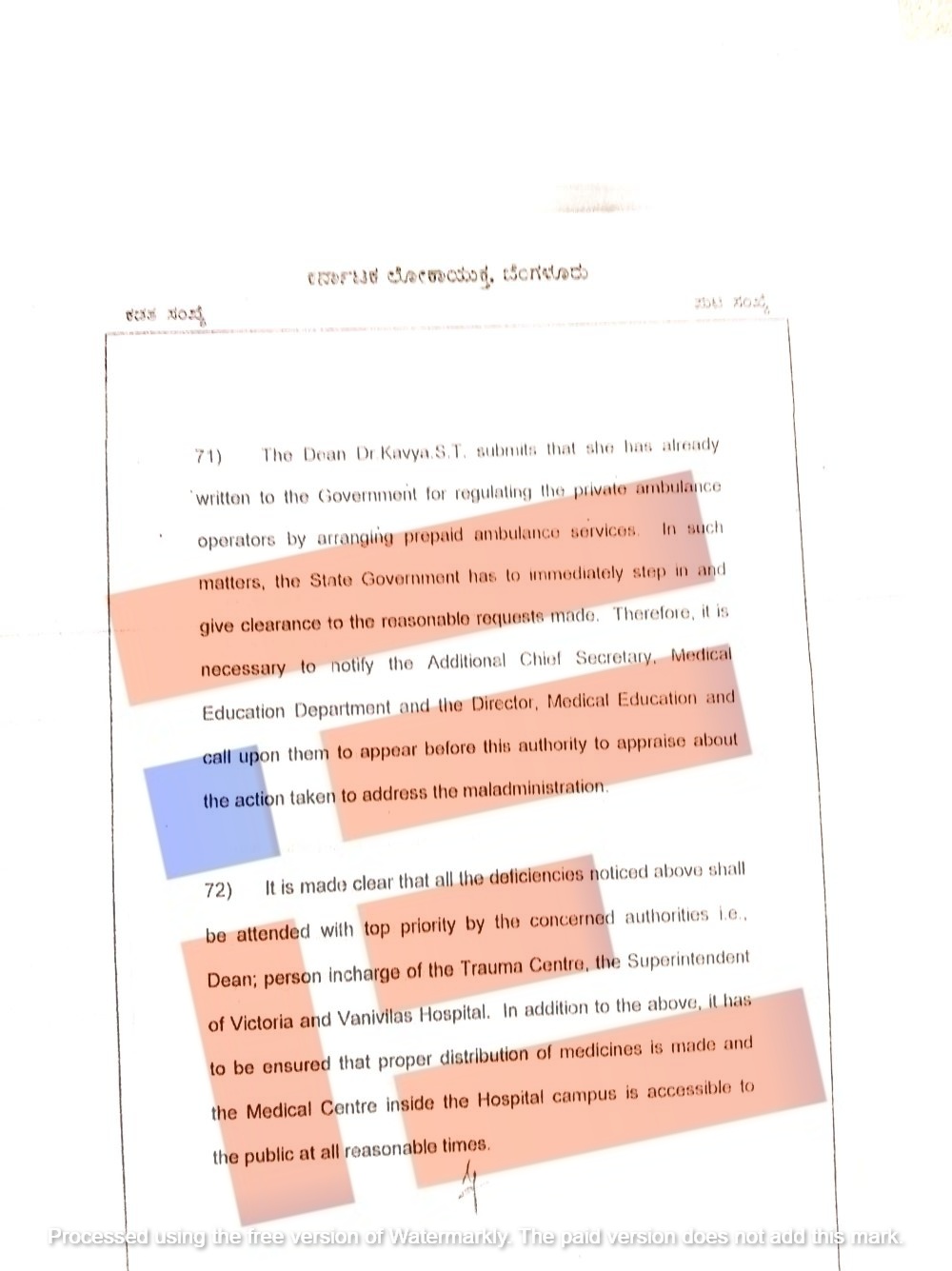 ಡೀನ್, ಟ್ರಾಮಾ ಕೇಂದ್ರದ ಹೊಣೆಗಾರ ವ್ಯಕ್ತಿ, ವಿಕ್ಟೋರಿಯಾ ಮತ್ತು ವಾಣಿವಿಲಾಸ್ ಆಸ್ಪತ್ರೆಗಳ ಅಧೀಕ್ಷಕರು ಈ ಎಲ್ಲಾ ಕೊರತೆಗಳನ್ನು ಸಂಬಂಧಿಸಿದ ಅಧಿಕಾರಿಗಳು ತುರ್ತು ಆದ್ಯತೆಯೊಂದಿಗೆ ಪರಿಹರಿಸಿ ಸ್ಪಷ್ಟಪಡಿಸಬೇಕು. ಇದಲ್ಲದೆ, ಔಷಧಿಗಳ ಸರಿಯಾದ ವಿತರಣೆ ನಡೆಯುವಂತೆ ಹಾಗೂ ಆಸ್ಪತ್ರೆ ಆವರಣದಲ್ಲಿರುವ ವೈದ್ಯಕೀಯ ಕೇಂದ್ರವು ಸಾರ್ವಜನಿಕರಿಗೆ ಎಲ್ಲಾ ಯುಕ್ತಿಯುಕ್ತ ಸಮಯಗಳಲ್ಲಿ ಲಭ್ಯವಾಗುವಂತೆ ಖಚಿತಪಡಿಸಬೇಕು ಎಂದು ಲೋಕಾಯುಕ್ತರು ವರದಿಯಲ್ಲಿ ನಿರ್ದೇಶಿಸಿರುವುದು ತಿಳಿದು ಬಂದಿದೆ.