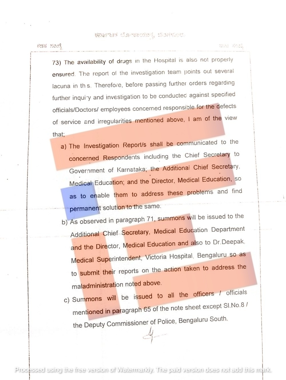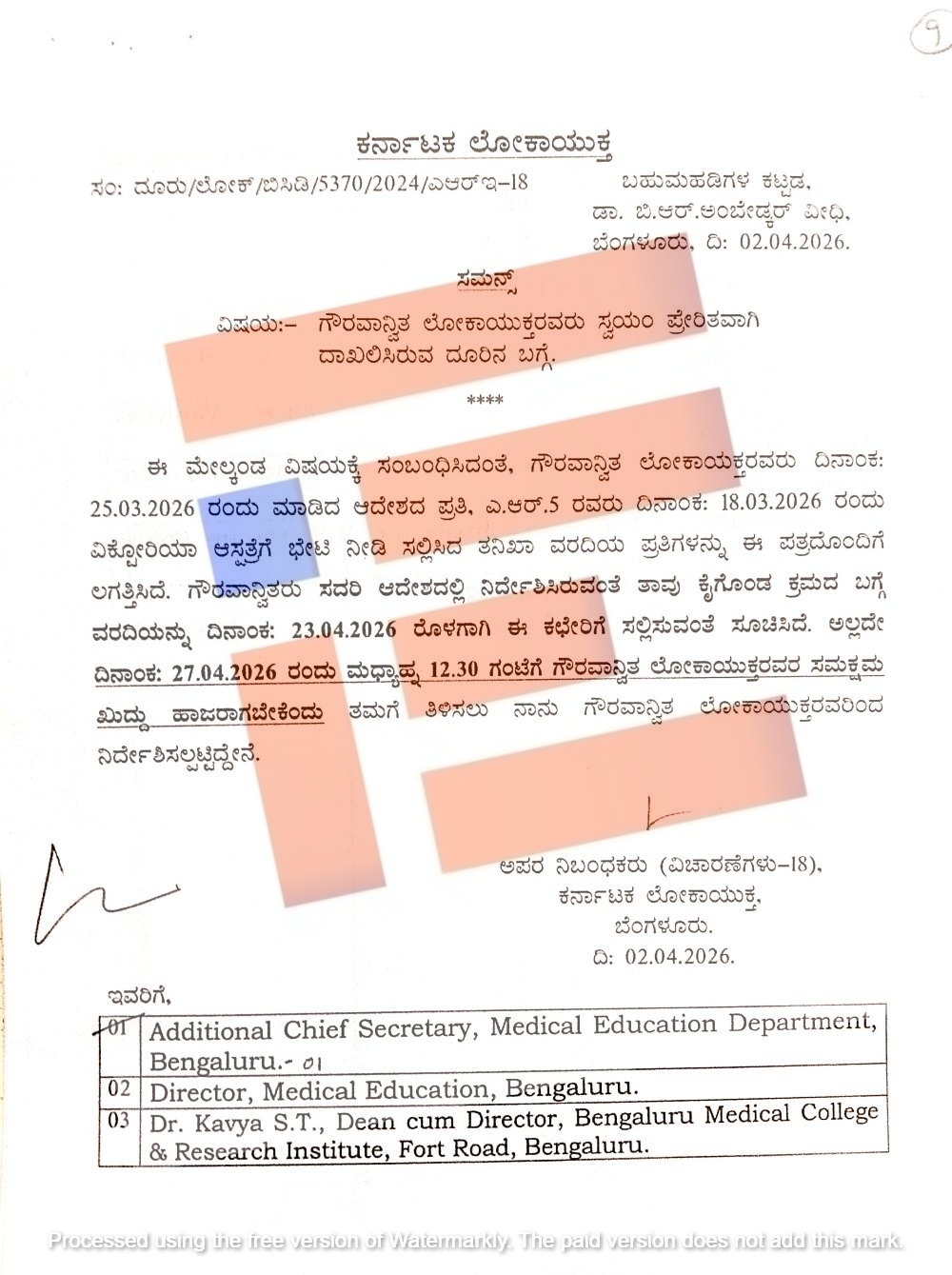 ಈ ವಿಚಾರಣೆಗೆ ಖುದ್ದು ಹಾಜರಾಗಬೇಕು ಎಂದು ವೈದ್ಯಕೀಯ ಶಿಕ್ಷಣ ಇಲಾಖೆಯ ಹೆಚ್ಚುವರಿ ಮುಖ್ಯ ಕಾರ್ಯದರ್ಶಿ ಮೊಹಮದ್ ಮೊಹ್ಸೀನ್,