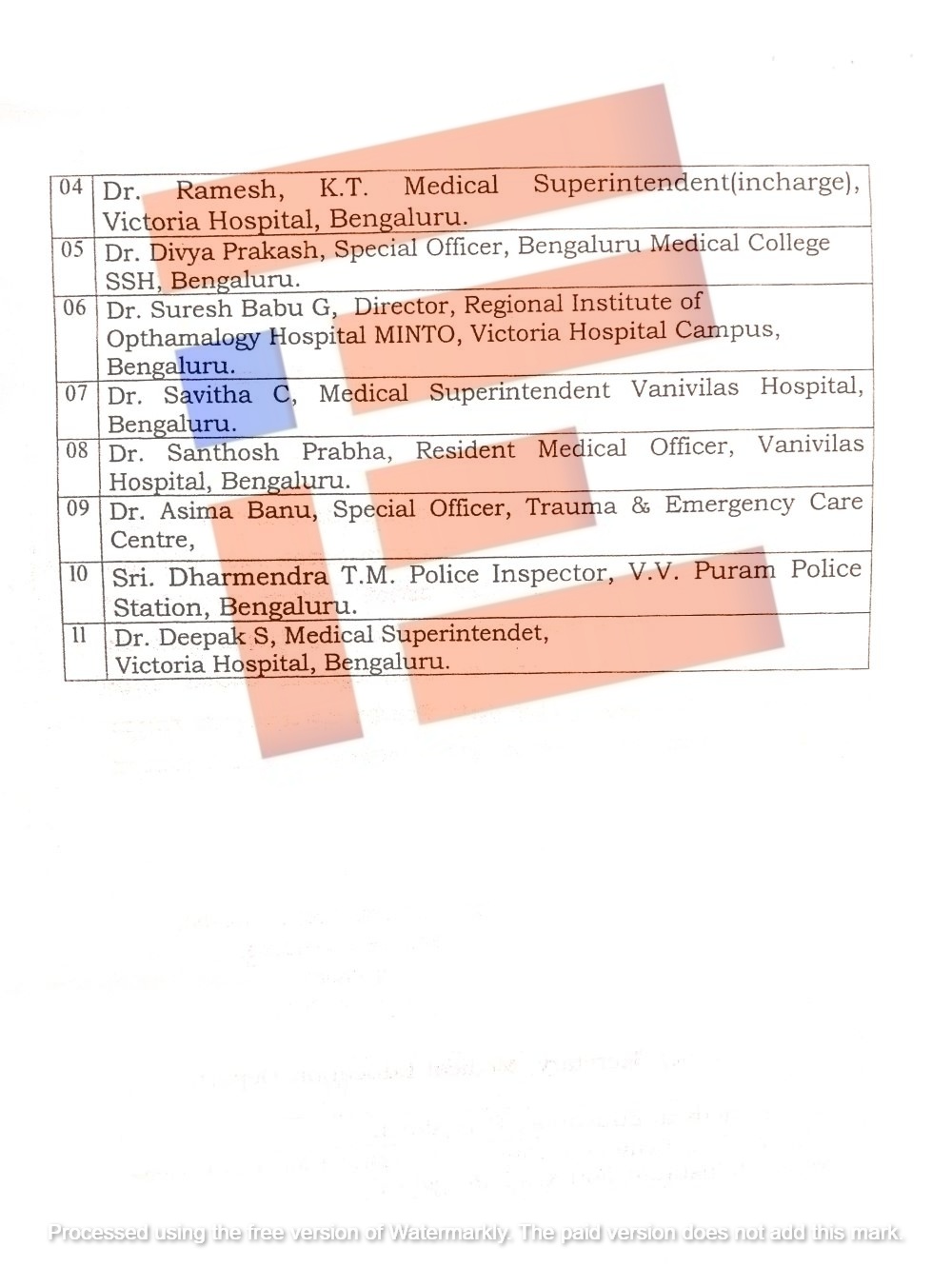 ಡಾ. ಸೋಮಶೇಖರ ಎಸ್.ಎ. (ಪ್ರೊಫೆಸರ್), ಡಾ. ದೀಪಕ್ ಎಚ್.ಆರ್. (ಅಸೋಸಿಯೇಟ್ ಪ್ರೊಫೆಸರ್), ಡಾ. ಗೌರವ್ ಎಂ. (ಅಸಿಸ್ಟೆಂಟ್ ಪ್ರೊಫೆಸರ್), ಡಾ. ಸತೀಶ್ ಬಾಬು ಡಿ.ಜಿ. (ಅಸಿಸ್ಟೆಂಟ್ ಪ್ರೊಫೆಸರ್), ಡಾ. ಶಶಾಂಕ್ ಜಿ. (ಅಸಿಸ್ಟೆಂಟ್ ಪ್ರೊಫೆಸರ್), ಡಾ. ರವಿವರ್ಮ ವಿ.ಎನ್. (ಅಸಿಸ್ಟೆಂಟ್ ಪ್ರೊಫೆಸರ್), ಡಾ. ಹೊಯ್ಸಳ ಬಿ. ಗೌಡ (ಸೀನಿಯರ್ ರೆಸಿಡೆಂಟ್ ಡಾಕ್ಟರ್), ಡಾ. ಹೇಮಚಂದ್ರ (ಅಸಿಸ್ಟೆಂಟ್ ಪ್ರೊಫೆಸರ್), ಡಾ. ಶ್ರೀನಿವಾಸ್ ಜಿ. (ಅಸಿಸ್ಟೆಂಟ್ ಪ್ರೊಫೆಸರ್), ಡಾ. ಯೋಗಾನಂದ ಎಂ. (ಅಸಿಸ್ಟೆಂಟ್ ಪ್ರೊಫೆಸರ್), ಡಾ. ಚನ್ನಬಸವರಾಜ್ (ಅಸಿಸ್ಟೆಂಟ್ ಪ್ರೊಫೆಸರ್), ಡಾ. ಪೂರ್ಣಿಮಾ ಆರ್. (ಅಸಿಸ್ಟೆಂಟ್ ಪ್ರೊಫೆಸರ್, ಸರ್ಜಿಕಲ್ ಆಂಕಾಲಜಿ) ಅವರು ಫೆಬ್ರವರಿ ತಿಂಗಳಲ್ಲಿ ಕೆಳಕಂಡ ವೈದ್ಯರು ತಮ್ಮ ಕರ್ತವ್ಯಕ್ಕೆ ಸಮಯಕ್ಕೆ ಸರಿಯಾಗಿ ಹಾಜರಾಗಿಲ್ಲ . ಇದನ್ನು ವೈದ್ಯಕೀಯ ಅಧೀಕ್ಷಕರ ಕಚೇರಿಯಿಂದ ಸಂಗ್ರಹಿಸಿದ ಮಾಹಿತಿಯ ಅನುಸಾರ ಶೋಧನಾ ತಂಡವು ಖಚಿತಪಡಿಸಿಕೊಂಡಿದೆ.